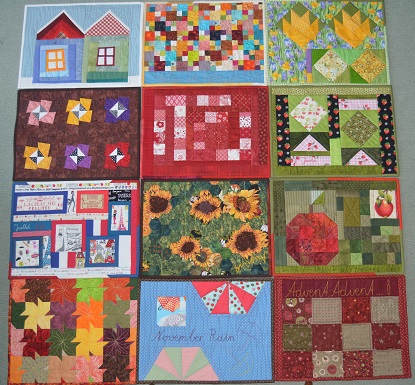 Es war gar nicht so leicht, alle Sets ordentlich auf ein Foto zu bannen. Deshalb habe ich auch keinen zweiten Versuch unternommen, als ich feststellte, daß das Augustset (das mit den Sonnenblumen) verkehrt herum lag. Ich habe mich bei den Sets an verschiedenen Techniken (März, April, Oktober, November) ausprobiert und vor allem auch Reste abgebaut. Neben den Aboquadraten waren das Bindingreste und schon ewig daliegende Arbeiten (Januar und August), die auf die Fertigstellung warteten. Würde man mich fragen, welches Set ich am liebsten mag, wäre das gar nicht so leicht zu beantworten. Der Juli ist wegen meiner frankophilen Seite ein Favorit wie auch die Sonnenblumen, gerade nach dem beindruckenden Besuch im van Gogh Museum in Amsterdam. Das Oktobermuster war eine echte Herausforderung, während mir die Stille des Januarsets auch sehr gut gefällt. Wie auch immer, es war toll, diese 12 Sets genäht zu haben. Deshalb hier ein besonderer Dank an Valomea und Doris, die diese Aktion initiiert und begleitet haben.